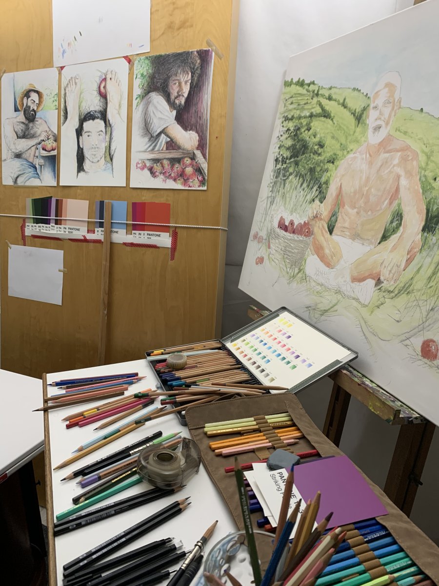 Wenn ich im Atelier sitze, das Papier vor mir, der Geruch von Holzstiften und Öl in der Luft, suche ich nach den Geschichten einzelner Menschen. Nach Momenten zwischen zwei Personen oder innerhalb einer Gruppe. Der Apfel wird dabei zum stillen Begleiter, ein Stück Natur im Hintergrund, das eine zusätzliche Bedeutungsebene öffnet. Er macht sichtbar, was sonst leicht übersehen wird: feine Spannungen, stille Nähe, ein Echo von etwas Persönlichem.