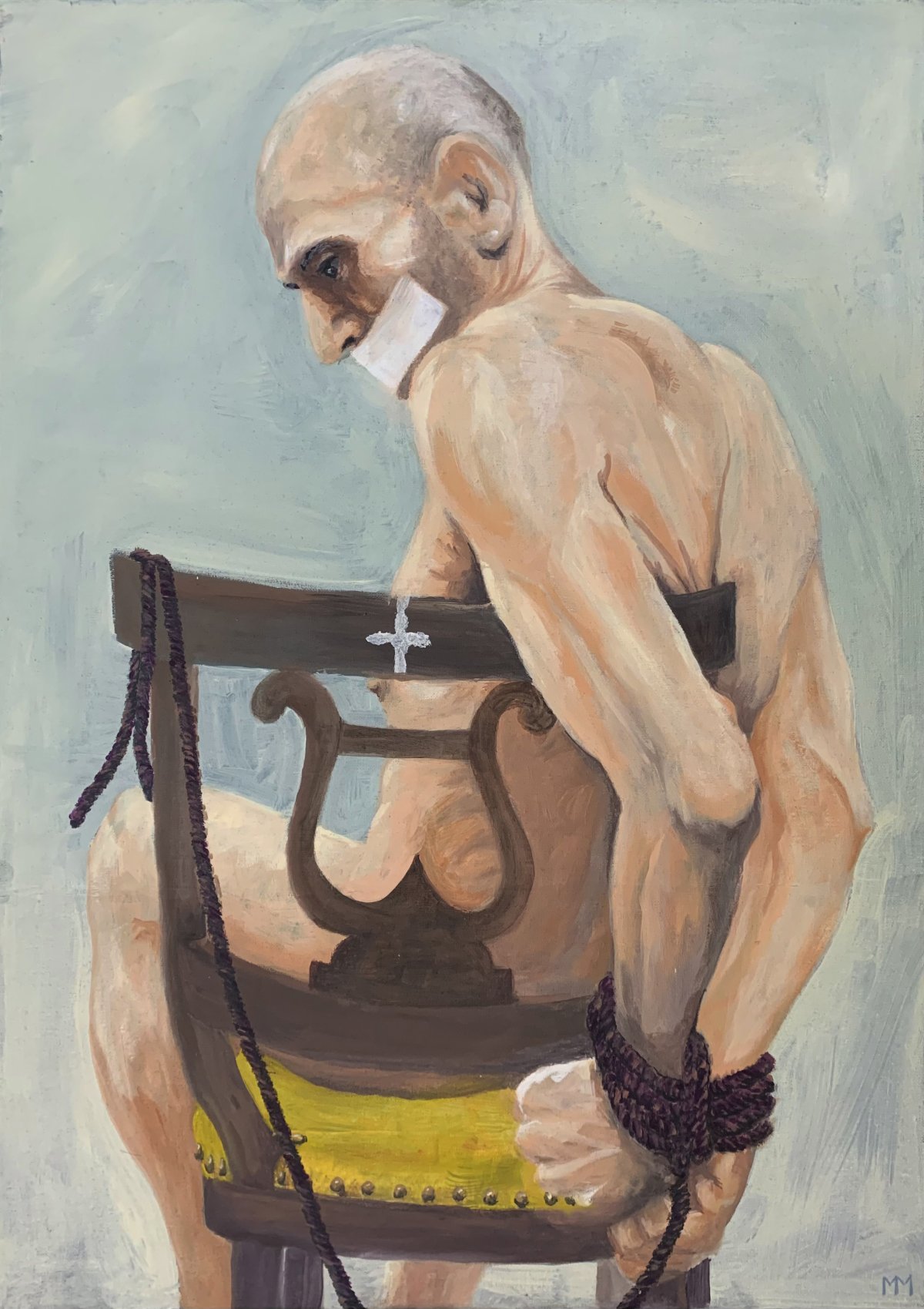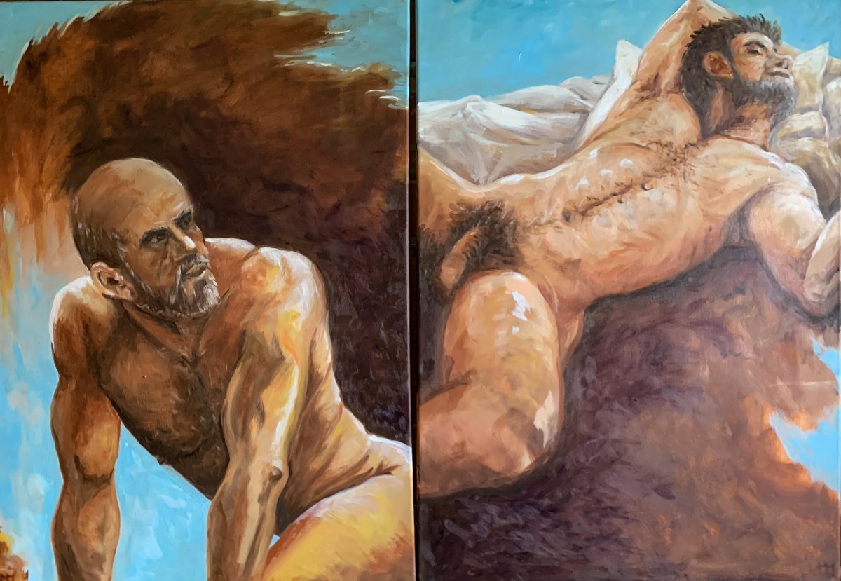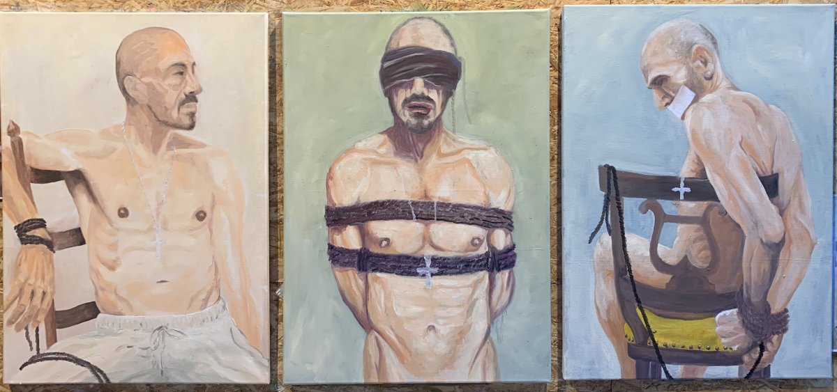 Doppel-Live-Portrait, «Bewerbung für den Vatikan», 5-2023, Oel auf Leinwand, 2x70x50cm
