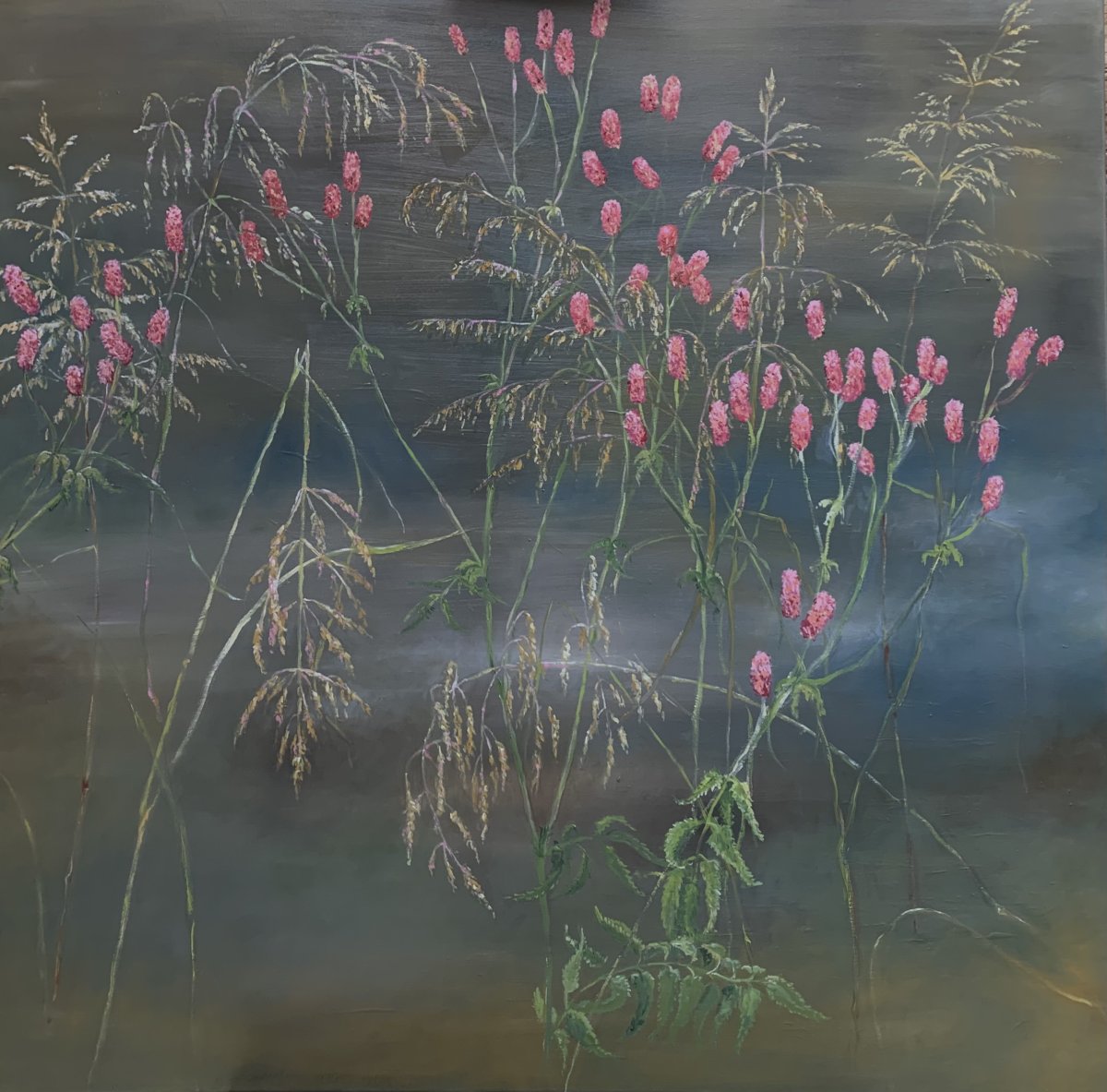 Wiesenknopf und Gräser, 8-2023, Öl auf Leinwand, 100x100cm